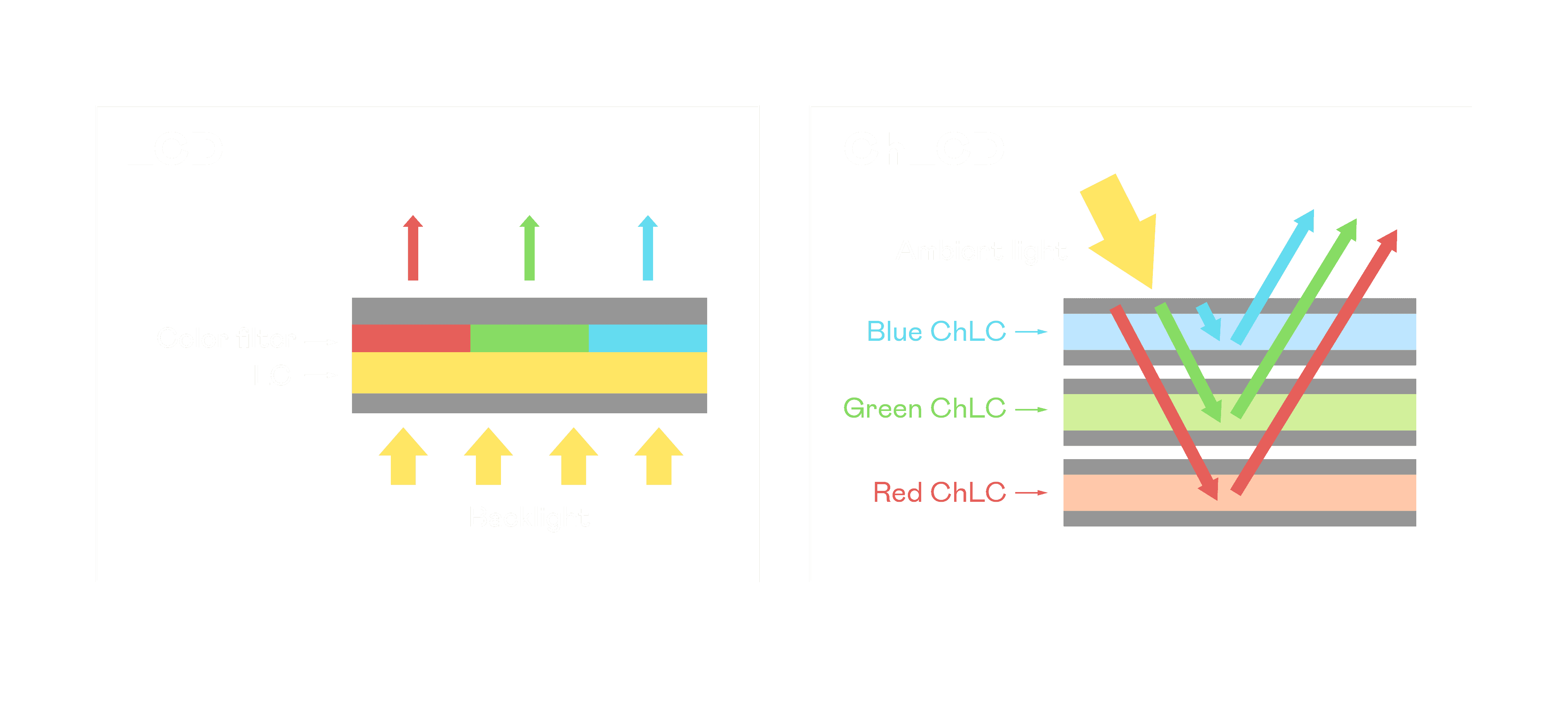 ChLCD 胆固醇液晶就如同纸张一样,,,透过反射环境光来显示影像,,,,因此长时间观看不易造成人眼视觉疲劳,,,可达到护眼效果。。当处于户外阳光下使用,,LCD 影像容易失真而不易观看,,,但胆固醇液晶仍可维持较佳的影像品质。。